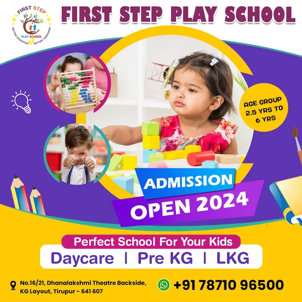 First Step Play School in Tirupur East, Tirupur functions as a local preschool offering play-based early childhood education. With its accessible location, classroom learning setup, and focus on foundational development, the institute serves families looking for preschool education options in the Tirupur East area.