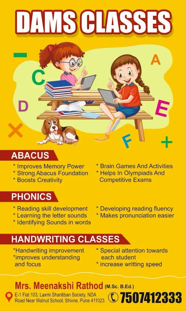 DAMS ACTIVITY CLASSES is a premier destination for hobby enthusiasts in Shivane-Khadakwasla, Pune. Established in 10-2024, the company offers a diverse range of enriching Abacus Classes activities for individuals of all ages. With passionate instructors who are experts in their fields, DAMS ACTIVITY CLASSES prides itself on providing a supportive and friendly learning environment that encourages creativity and exploration.